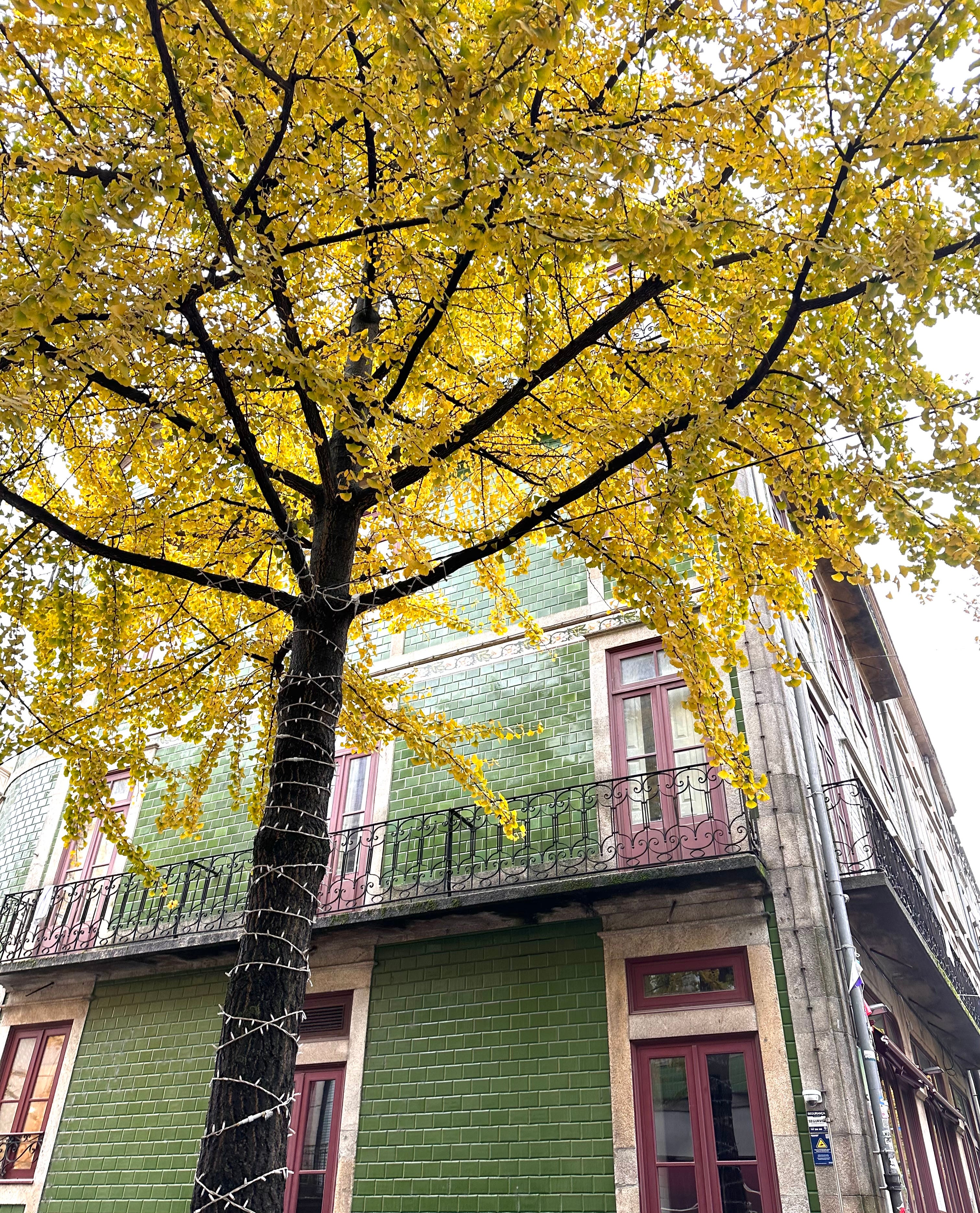 In Porto, Portugal, I discovered that December brings the yellowest of leaves to the Gingko trees lining the hilly streets. One of many fascinating facts about the Gingko biloba is that a tree will shed its canopy of yellow leaves all at once in a magical leaf drop. The other is that they are living fossils, predating the dinosaurs. The golden trees are so resilient that six survived the Hiroshima atomic bombs, sprouting leaves in the spring where they became symbols of hope. Their immune systems, in the cambium layer, suggest they theoretically can live forever, absent external forces.