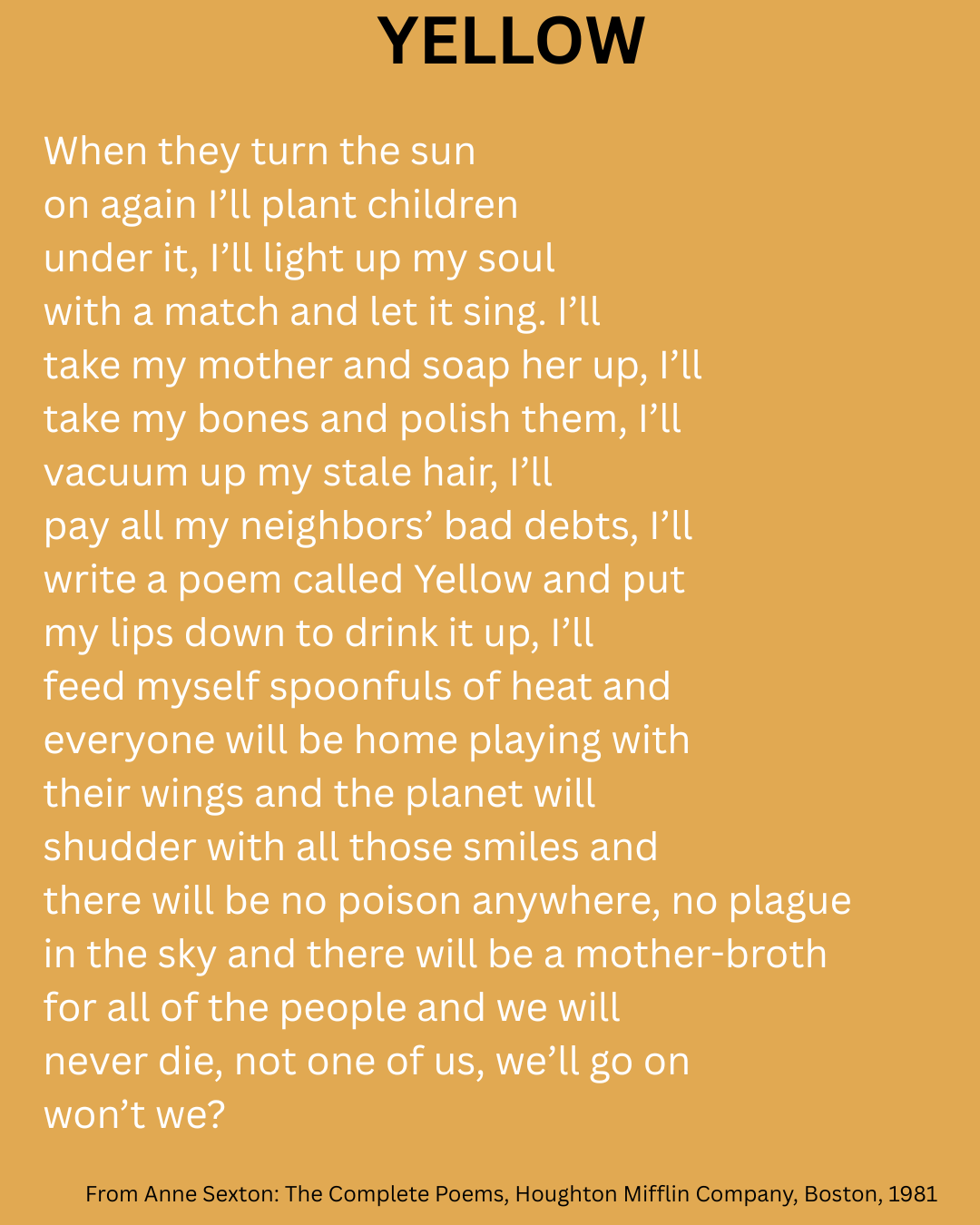 The color yellow does that. Once you’re attentive, you’ll find it everywhere. Here’s a poem by Anne Sexton that my friend & poet Jade Rivers brought to my attention: